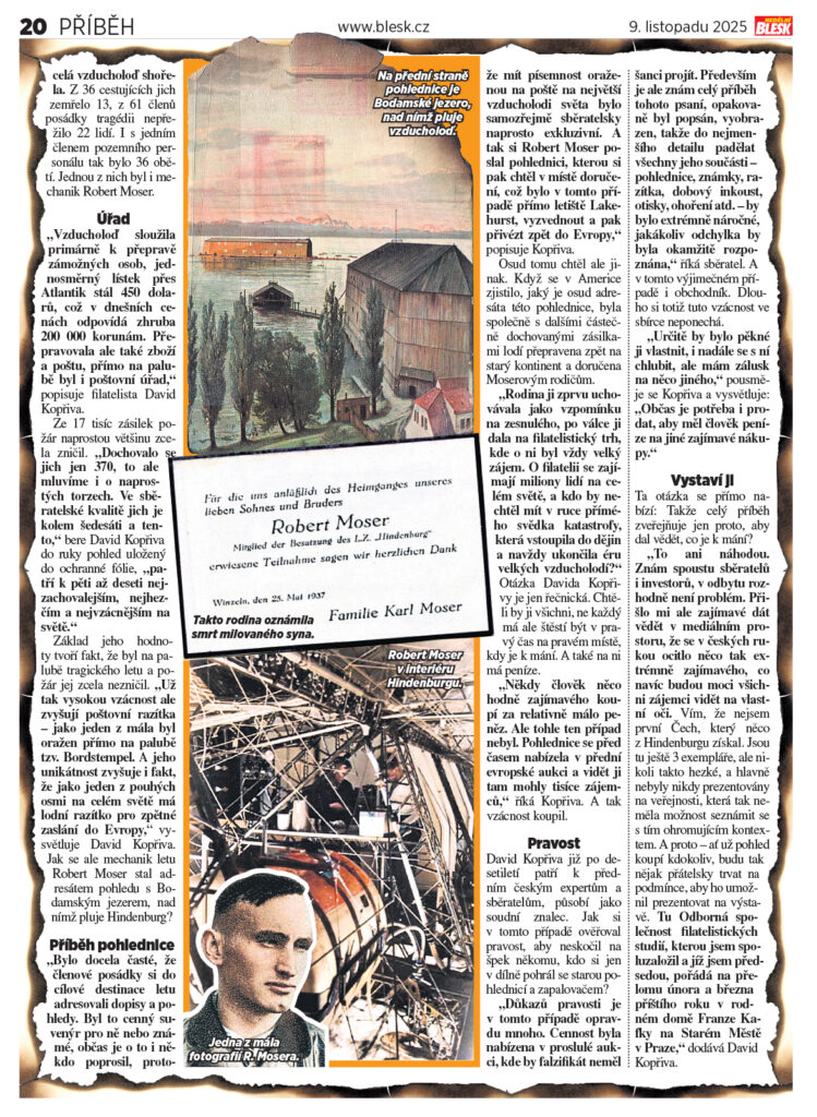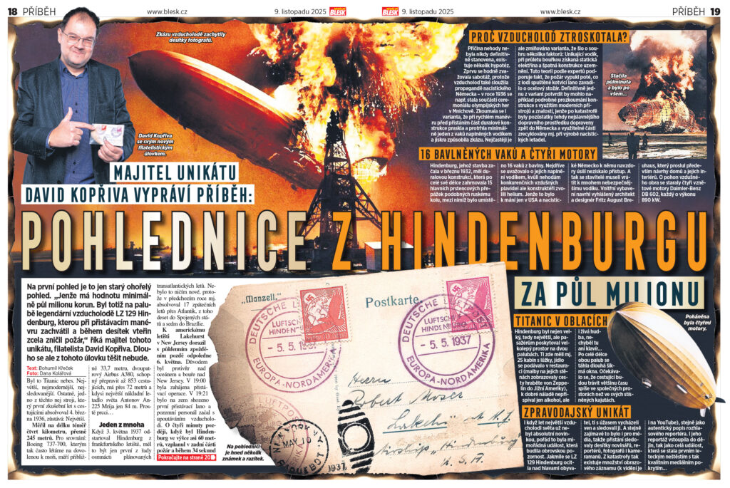 Na první pohled je to jen starý ohořelý pohled. „Jenže má hodnotu minimálně půl milionu korun. Byl totiž na palubě legendární vzducholodě LZ 129 Hindenburg, kterou při přistávacím manévru zachvátil a během desítek vteřin zcela zničil požár,“ říká majitel tohoto unikátu, filatelista David Kopřiva. Dlouho se ale z tohoto úlovku těšit nebude.